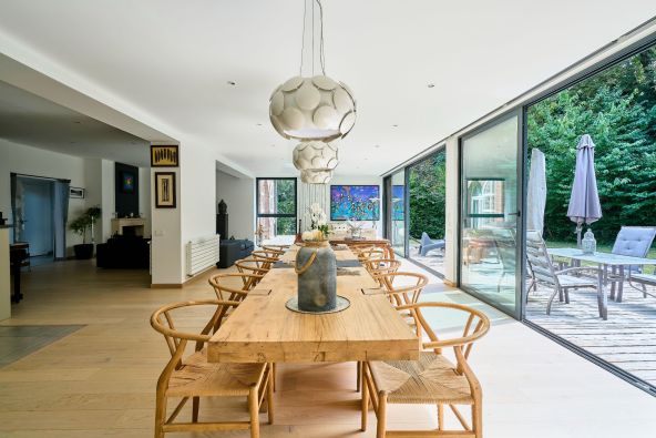Les volumes de réception, exposés Sud / Sud-Ouest, profitent d’une luminosité optimale et s’ouvrent de plain-pied sur une vaste terrasse, puis sur un jardin paysager de 1 300 m², parfaitement au calme, niché dans un écrin de verdure sans vis-à-vis.