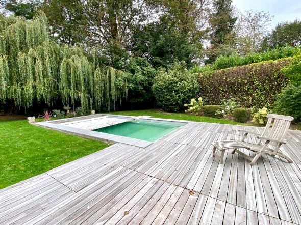 In the heart of a green and preserved setting, come and discover this beautiful detached house, built on a plot of 1,500 m², set back from the street for more tranquility, with easy parking and garage. From the entrance, the generous volumes and natural light immediately seduce. The large reception room, extended by large bay windows, offers a friendly atmosphere and opens directly onto the garden. Attached, the contemporary kitchen with dining area integrates elegantly into this living space. A second living room, modular according to your desires, can accommodate an office, a games room or a TV area, a shower room ideally completes the ground floor offering the possibility of arranging a bedroom on the ground floor adjacent to the shower room. Upstairs, the landing distributes three bedrooms, a bathroom and a beautiful master suite with its private bathroom, real cocoon of privacy. Outside, the large wooden terrace, the swimming pool and the landscaped garden without vis-à-vis offer an idyllic setting to relax and entertain. Space, light and serenity define this family home that is just waiting for your visit...