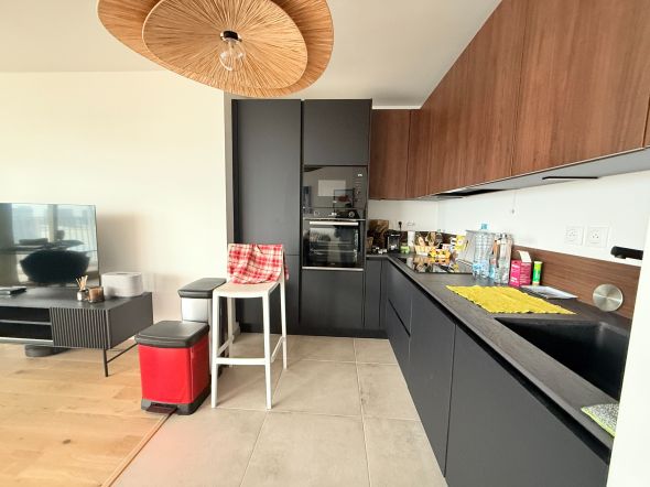 LILLE CENTRE, RESIDENCE EMBLEM ! Superbe appartement meublé type 3 de 75m2 hab, vue panoramique, parIn a prestigious, recently built, secure residence, discover this superb, fully equipped two-bedroom flat on the 14th floor with lift, offering high-end amenities and an exceptional panoramic view of the city and its monuments. The flat comprises an entrance hall with storage space leading to a spacious, bright living room opening onto a terrace, ideal for enjoying the sunsets over Lille. The fully equipped contemporary kitchen blends harmoniously into the living space. A hallway with storage leads to two comfortable bedrooms, one with built-in cupboards, and a beautiful shower room equipped with a washing machine and tumble dryer. A pantry completes the ensemble. All rooms have direct access to the terrace, a real asset of this rare apartment in the area. Secure parking at €150 in addition to the rent as well as a bicycle storage room within the residence.