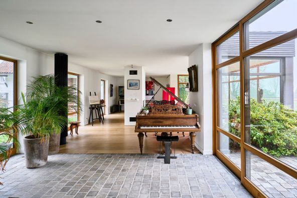De larges baies vitrées inondent la pièce de lumière et ouvrent sur une vue imprenable du jardin et de la piscine.