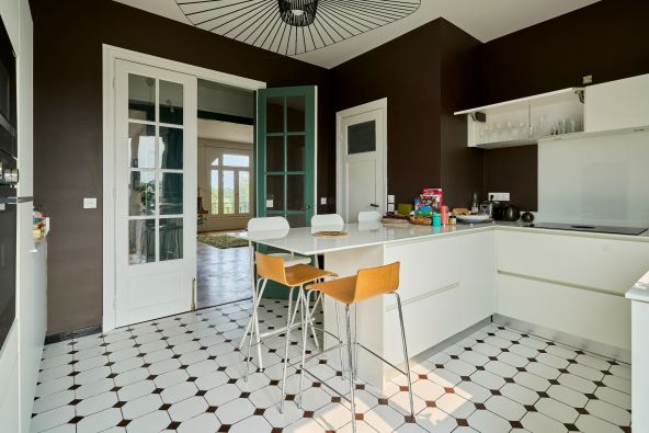 La cuisine séparée, intégralement reprise, mêle esthétisme et fonctionnalité. Entièrement équipée d’un électroménager encastré haut de gamme, elle est prolongée par un cellier/buanderie offrant un espace de rangement précieux au quotidien.