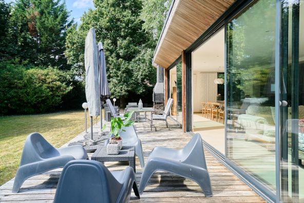Les volumes de réception, exposés Sud / Sud-Ouest, profitent d’une luminosité optimale et s’ouvrent de plain-pied sur une vaste terrasse, puis sur un jardin paysager de 1 300 m², parfaitement au calme, niché dans un écrin de verdure sans vis-à-vis.