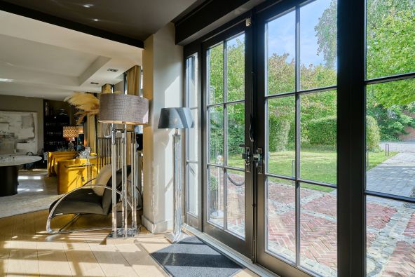 Le rez-de-chaussée propose une entrée majestueuse desservant un vaste espace de réception de 70 m² baigné de lumière, aujourd'hui aménagé en showroom. Traversant, il offre une vue imprenable sur la campagne environnante ainsi qu’un accès direct au jardin exposé sud-est. Une cuisine ouverte peut y être installée (arrivées d’eau déjà prévues).