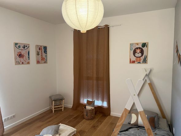 Le séjour, orienté plein sud, s’ouvre sur la terrasse et le jardin, tandis que les chambres profitent d’une double exposition est-ouest, garantissant une belle luminosité tout au long de la journée.