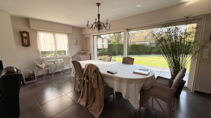 L’entrée, avec rangements et toilettes invités, dessert une vaste pièce de réception traversante, largement ouverte sur le jardin grâce à de grandes baies vitrées. Le salon s’organise autour d’un insert, prolongé par une salle à manger lumineuse tournée vers l’extérieur.