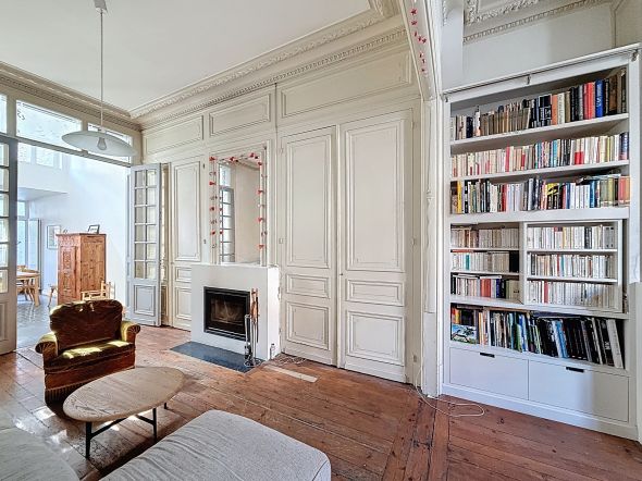 Dès l’entrée, un long couloir mène à un superbe double salon en enfilade, sublimé par son parquet d’origine, ses moulures au plafond, son insert et sa belle hauteur sous plafond. L’ensemble dégage une atmosphère chaleureuse et raffinée, typique du charme de l’ancien.