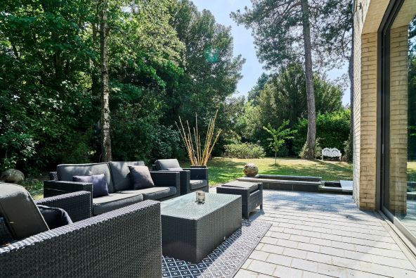 Dès l’entrée, le rez-de-chaussée dévoile d’impressionnantes pièces de réception totalisant près de 140 m², sublimées par une très belle hauteur sous plafond. Cet élégant espace de vie, entièrement ouvert, accueille un vaste salon entièrement domotisé (gestion des éclairages, système sonore Bang & Olufsen, rideaux motorisés, rétroprojecteur), prolongé par une terrasse et offrant une vue dégagée sur le jardin paysager et ses pins majestueux.