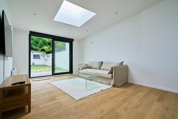 À l’avant, une petite cour permet de stationner vélos ou trottinettes, un vrai plus en ville. À l’arrière, le jardin intimiste offre un extérieur sans vis-à-vis, facile à entretenir.