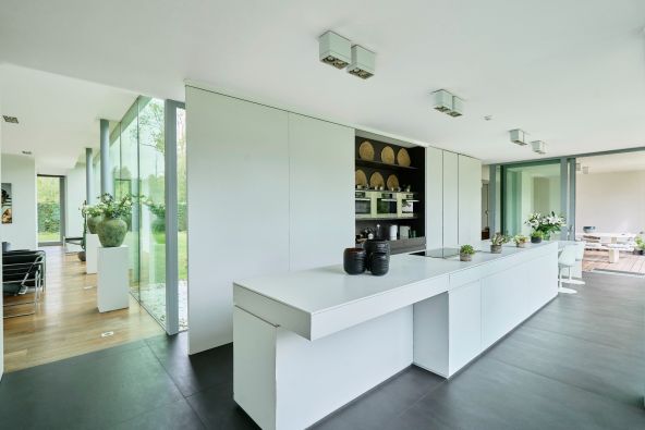 Le salon de détente, bordé de trois immenses baies vitrées, offre une vue panoramique sur l’extérieur. À la suite, une cuisine spectaculaire, orientée sud-est, avec îlot en Corian et électroménager haut de gamme, ouvre sur une loggia et un espace barbecue sur-mesure semi-enterré, pensé comme un salon d’été convivial pouvant accueillir jusqu’à 10 personnes.