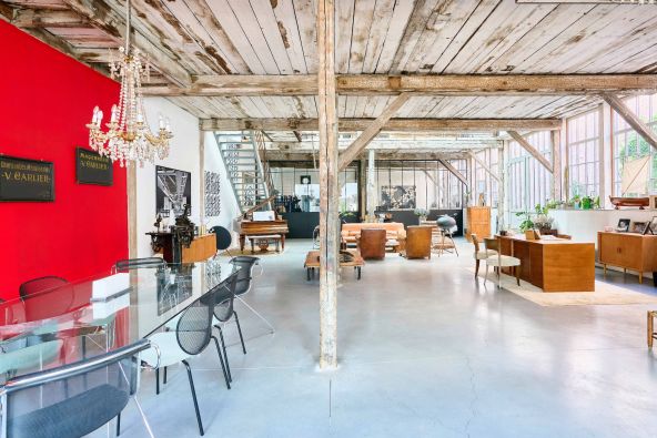 Édifié sur deux niveaux, ce bien rare séduit dès l’entrée par un impressionnant open space de 220 m² sous toit cathédrale, où volumes et lumière se répondent harmonieusement. Les nombreuses fenêtres et verrières d’atelier, signatures de l’architecture industrielle, baignent les espaces de réception d’une luminosité exceptionnelle tout en rappelant l’histoire artisanale du lieu.