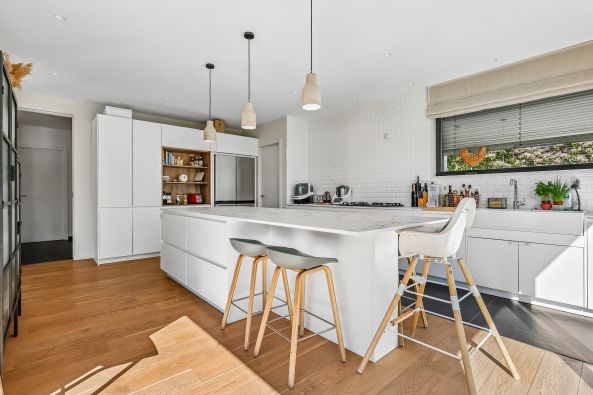 La cuisine (29m2), véritable pièce de vie, s’organise autour d’un vaste îlot central, pensé pour le quotidien comme pour recevoir. Entièrement équipée avec des matériaux haut de gamme, dont un plan de travail en Dekton, elle dialogue harmonieusement avec le séjour. Le salon (49 m2), parqueté et largement ouvert sur l’extérieur grâce à de grandes baies vitrées, profite d’une vue dégagée sur le jardin exposé plein sud. Un espace plus intimiste, structuré autour d’un insert vitré, complète cet ensemble.